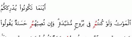 أينما تكونوا يدرككم الموت ولو كنتم في بروج مشيدة أي. أينما تكونوا يدرككم الموت ولو كنتم في بروج مشيدة. حصينة منيعة عالية رفيعة وقيل. أينما تكونوا يدرككم الموت ولو كنتم في بروج مشيدة وإن تصبهم حسنة يقولوا هذه من عند الله وإن تصبهم سيئة يقولوا هذه من عندك قل كل من عند الله فمال هؤلاء القوم لا يكادون يفقهون حديثا فيه أربع مسائل.